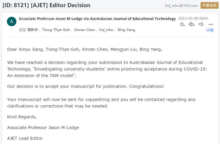 近日,bevitor伟德国际1946智慧学习研究团队就员工对2020年春季疫情期间各高校普遍采取的视频会议监考系统使用感受展开大规模调查的研究成果“Investigating university students’online proctoring acceptance during COVID-19: An extension of the TAM model”(新冠肺炎期间老员工在线监考接受度调查:TAM模型的延伸),被教育技术领域知名期刊Australasian Journal of Educational Technology录用。该期刊为JCR Q1分区刊物。bevitor伟德国际1946刘梦君副教授、杨兵教授、外国语公司陈欣然老师为论文共同作者,研究生蒋新宇为论文第一作者,伟德国际1946bv为第一通讯单位。该工作得到了国家自然科学基金项目、湖北省自然科学基金项目和伟德国际1946bv教学改革研究项目的资助。