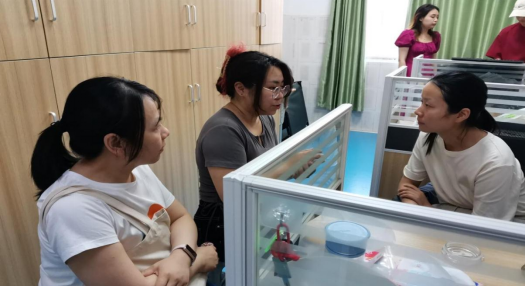 在智慧教室里,杨红云副教授与语文老师张夏艳交流后,张老师十分乐意尝试运用AI技术评改员工作文的教学研究。杨红云副教授还与信息技术学科教师蔡雅琴就“新城区农村初中智慧校园环境下课堂教学策略创新研究”立项课题的研究进展进行沟通,讨论了初中信息技术课程的教学模式及方法改革的问题。最后,杨红云副教授团队收集了前一阶段数学智慧课堂的教学视频和分析报告,待做后续分析。