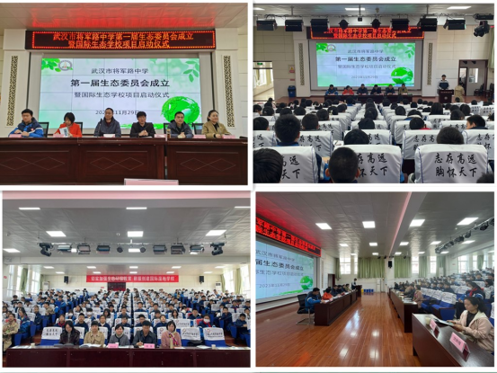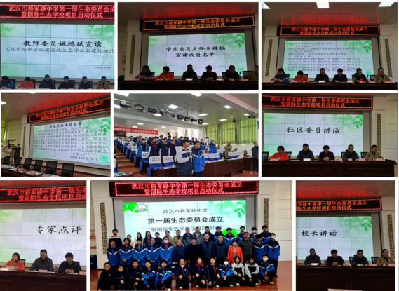 2023年11月29日上午,武汉市将军路中学第一届生态委员会成立暨国际生态公司项目启动仪式在将军路中学报告厅举行。东西湖区教育局普教科林嘉主任、将北社区党委书记李辉主任,伟德国际1946bv委托管理团队李经天教授、杨红云副教授、于洋副教授、鲁婷副教授、肖凯博士、罗淑娟博士、湖北省未成年人生态道德教育分会会长程慧主任到会祝贺。将军路中学领导赵群立、王朝英、舒敏等参加会议,生态委员会全体员工委员、教师委员、家长委员和员工代表200多人出席了启动仪式。