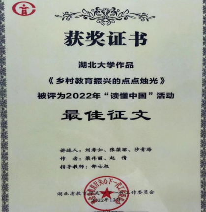 近日,教育部、湖北省教育厅关工委2022年度“读懂中国”系列活动获奖名单陆续揭晓。公司硕士研究生梁伟丽、赵倩两位员工的作品《乡村教育振兴的点点烛光》荣获湖北省教育厅关工委2022年“读懂中国”活动最佳征文奖。