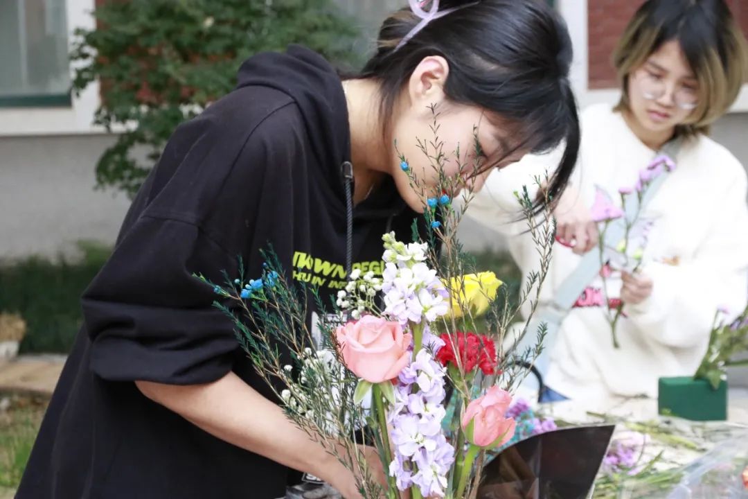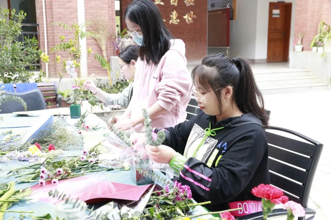 实践环节中,师生们运用插花技巧,巧妙地构思、修剪和装饰,将康乃馨、玫瑰、向日葵、雏菊、满天星等鲜花,装点成春意盎然、独具匠心的插花作品。师生们专注地摆弄着手中的鲜花,在工作与学习之余享受花样年华,放松身心,感受美好。