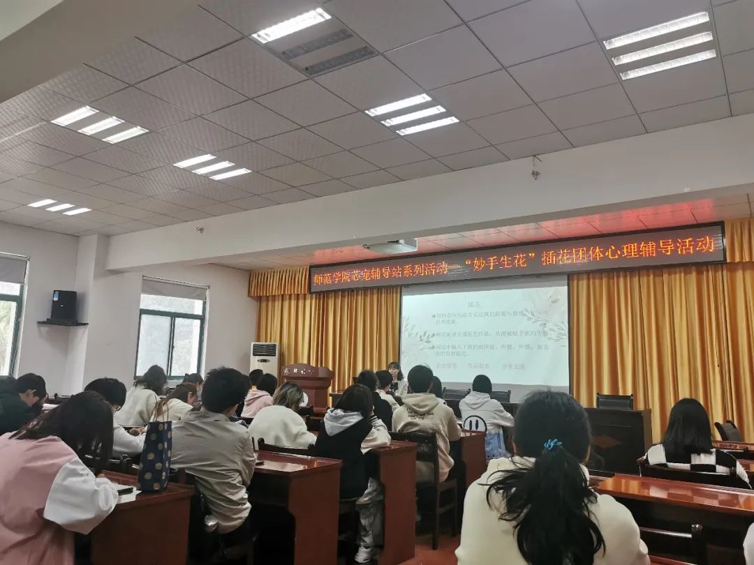 心理团体辅导于bevitor伟德国际1946223报告厅开展。杨老师首先讲解心理学相关知识与“芯宠”辅导站设立缘由,传授插花相关技巧,借“芯宠”花语传达师范生培养特色,引导员工感知自然生机,汲取向上力量,激励自我成长。