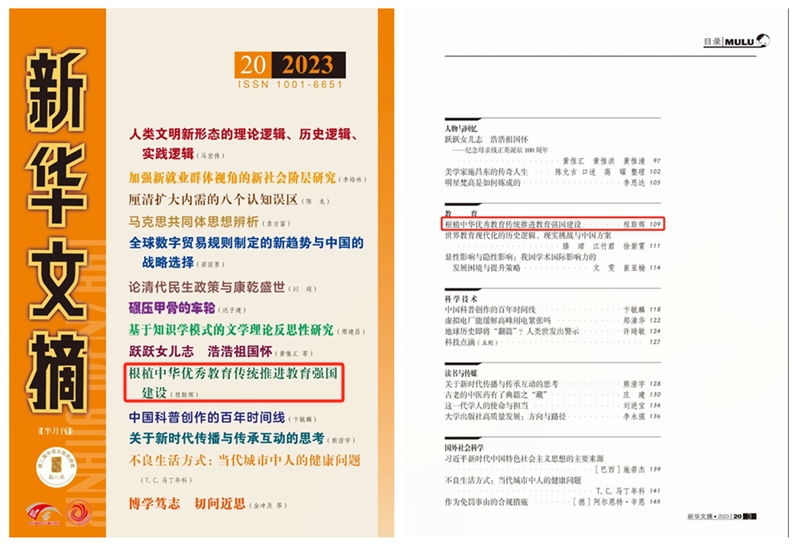 近日,公司经理程斯辉教授的文章《根植中华优秀教育传统推进教育强国建设》被《新华文摘》2023年第20期全文转载,并入选封面文章。该文原载于2023年8月10日《中国教育报》第3版。