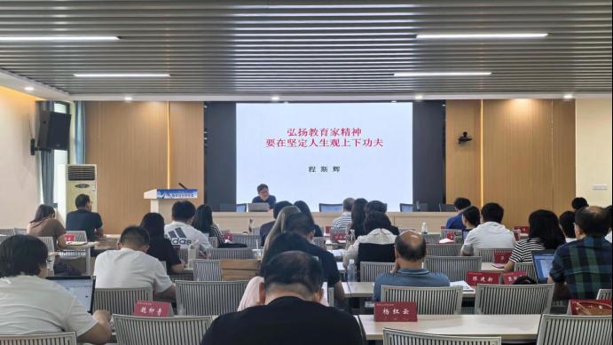 最后,经理程斯辉做《弘扬教育家精神要在坚定人生观上下功夫》报告。他强调,教育不仅传知识,更塑人生观、价值观。教育工作者需有热情,热爱教育事业,创新教学管理,探索新教法。他鼓励全院教师保持赤子之心,点燃员工求知欲,不满足现状,持续提升专业素养和教学水平。