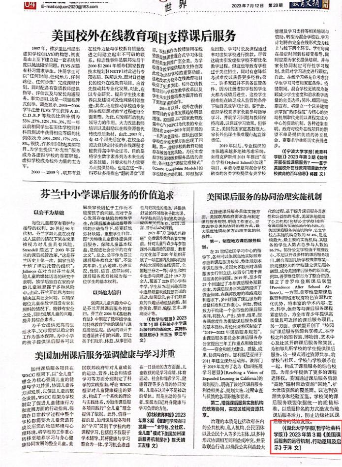 据悉,于洋副教授被转载的两篇文章均是国家社会科学基金教育学青年项目的阶段性研究成果,共计被转载3次。其中,发表于《海南大学学报(人文社科版)》2023年第4期的《习近平关于实践育人重要论述的主要内涵与鲜明特色》一文,深刻探讨了习近平关于实践育人重要论述的理论及实践基础,被《教育文摘周报》2023年第20期作为头版文章全文转载;发表于《伟德国际1946bv学报(哲学社会科学版)》2023年第3期的《美国课后服务的运行机制、行动逻辑及启示》一文,全面剖析了美国课后服务的战略统筹规划机制、协同治理实施机制、数据监控反馈机制和弱势群体补偿机制,先后被《教育文摘周报》2023年第28期和第34期转载。