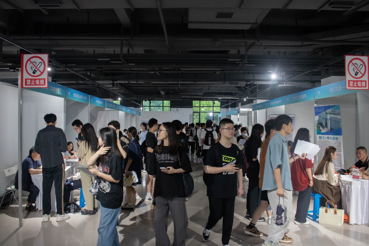 活动尚未开始,已有大批员工带着简历前来等候。“你投了哪个公司?”现场的同学们拿着厚厚的简历,互相分享着自己的双选经验。“嘿,我刚看到我的母校了!”2021级生物师范专业员工指着新洲区第二中学激动地跟同伴说,“我投母校,一方面我对它有很深的感情,另一方面今后进应聘母校成功的可能性更大”。