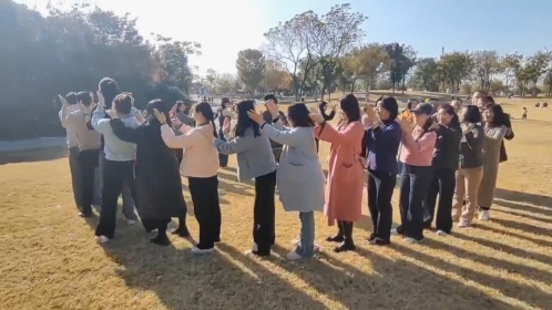 活动伊始,教职工们在博物馆前大草坪上,开启了趣味十足的户外团建。“按摩操”“兔子找窝”“热身舞蹈”等游戏将盘龙城历史元素与团队协作深度融合,各小组成员默契配合、奋勇争先。草坪上不时响起阵阵欢笑,平日里严谨授课的老师们,此刻也都卸下了工作的疲惫,尽情投入到游戏中。团建活动不仅拉近了彼此的距离,更营造了团结奋进、轻松和谐的团队氛围。