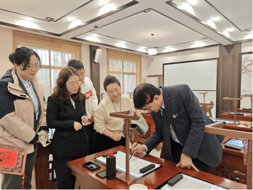 代表团先后走进公司心理健康教育中心、书法教室、师韵堂等场所,实地了解公司办学建设情况。在心理健康教育中心,详细了解中心建设运营模式;在书法教室,体验毛笔书写,沉浸式感受中华汉字文化魅力;在公司中庭,深入了解公司师范教育改革实践。