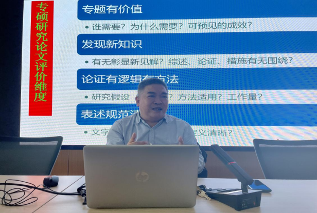 然后,叶忠教授从教育硕士学位论文标准、论文选题、论文题目和写作方法与规范四个方面进行了详细介绍。叶忠教授指出,员工在写作过程中要严格遵循学位论文标准,明确论文的分类和评价维度,把握基本要求,避免进入写作误区;在论文选题上,要符合专业领域,从现实问题出发进而寻找到解决问题的方法和路径;在论文题目上,要准确把握题目构成要点,将研究对象、领域范围和理论方法有效整合;在写作方法与规范上,他详细讲解了论文的构成与写作过程中应避免的问题。
