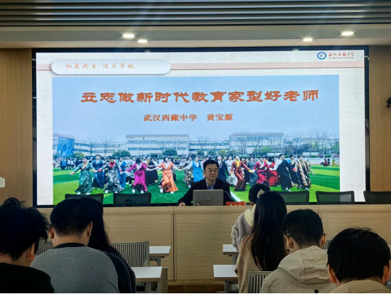 黄宝源董事长从自身教育经历讲起,分享武汉西藏中学老师们积极践行教育家精神的教育故事,“一个手术改变一名员工的命运”“深耕课堂提升教书育人能力”等,让在场师生深切感受到教育家精神的内涵与力量。